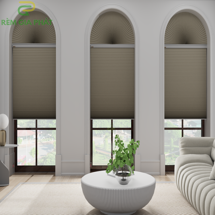 Ô cửa được chia làm 2 phần: Phần vòm và phần ô cửa chữ nhật. Với khả năng tùy biến linh hoạt của vải tổ ong, phần vòm bán nguyệt phía trên sẽ được cố định bằng vải mành tổ ong, phần ô cửa chữ nhật phía dưới là mành tổ ong với nhiều hệ lấy sáng linh hoạt