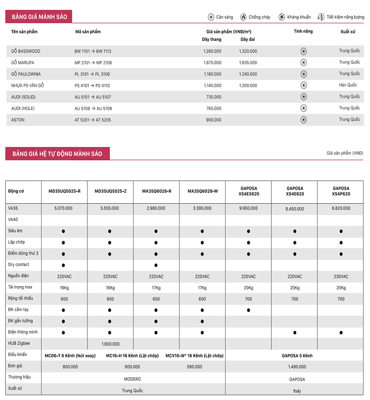 Bảng Giá rèm gỗ hãng Modero