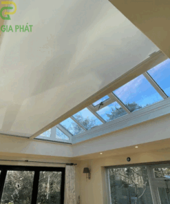 – Chất liệu rèm trần che mái kính trong nhà: Sử dụng chất liệu vải phủ nhựa dạng trơn chống nắng 100% hoặc vải phủ nhựa dạng lưới chống nắng 80%.