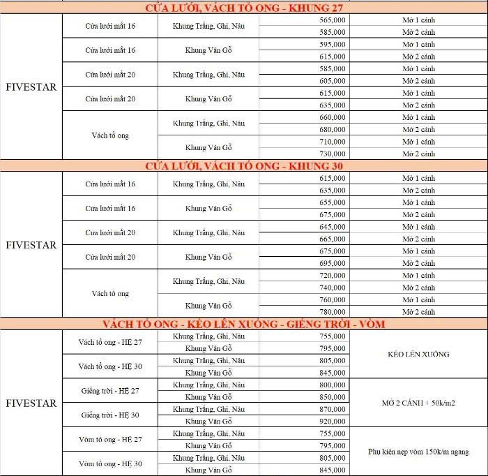 Giá thành các sản phẩm vách tổ ong phụ thuộc khá nhiều vào hệ khung nhôm dày hay mỏng, to hay nhỏ. Hiện trên thị trường có các hệ khung nhôm gồm: hệ 27, hệ 30, hệ 32, hệ 42.